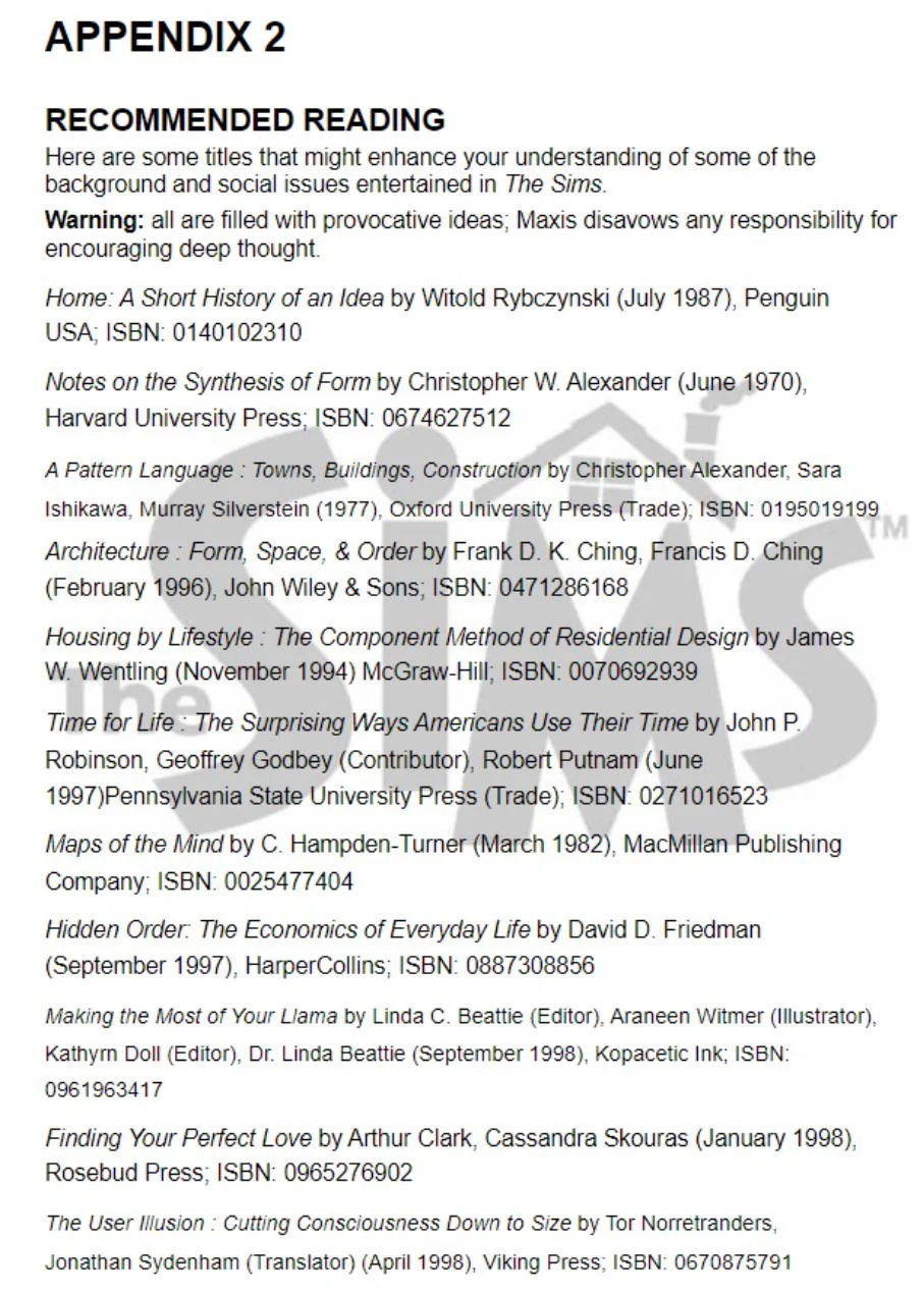 Wrights auf Recherche fußender Designansatz für Die Sims war keineswegs neu, vielmehr gehörte es zum festen Konzept der Maxis-Spiele, dass diese sich auf (populär-)wissenschaftliche Arbeiten zum entsprechenden Setting stützten: So war SimCity (1989-) stark von den Arbeiten Jay Wright Forresters, dem Vater der Systemdynamik beeinflusst und Wright hatte sich zur Vorbereitung auf SimAnt (1991) mit den Arbeiten des Biologen und Pulitzer-Preis-Gewinners Edward O. Wilson zur „emergenten Intelligenz“ von Ameisen vertraut gemacht. Dieses Vorgehen schrieb sich auch in das Marketing der Spiele ein: Das Simulationsgenre nahm ohnehin für sich in Anspruch, realistische Szenarien zumindest näherungsweise abzubilden6, und Wright verstärkte den Eindruck eines wissenschaftlich fundierten Wirklichkeitsbezuges gezielt, indem er den Anleitungen Literaturlisten beilegen ließ.7
