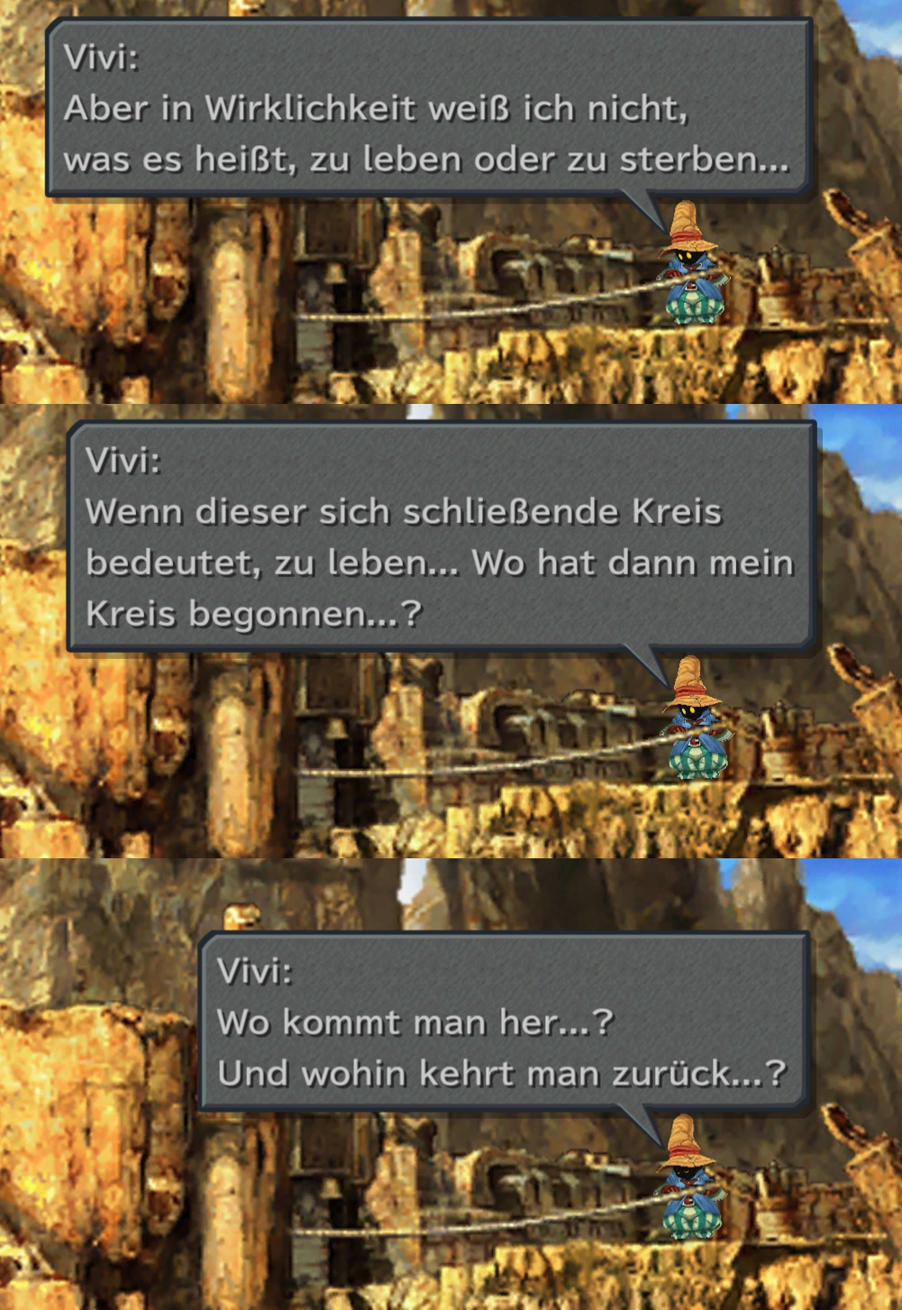 Mit diesen Fragen sieht sich auch die Figur Vivi aus dem neunten Teil der Videospielreihe Final Fantasy konfrontiert. Er hat zunächst keine Ziele, er weiß weder, woher er stammt, noch wohin er gehen soll.