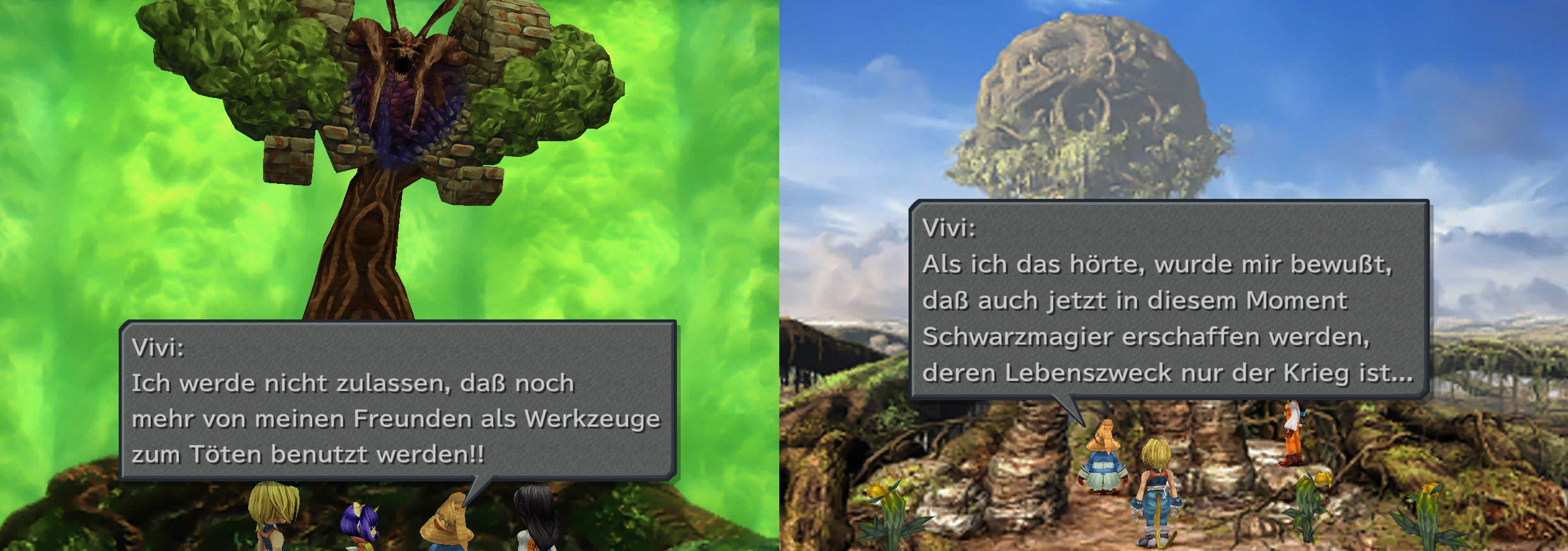 Vivi ist frei, diese Entscheidung zu treffen, er ist sogar zu einer Entscheidung verurteilt, denn auch wenn er sich nicht entschieden hätte, wäre das ebenfalls eine Handlung gewesen, vor der er sich hätte verantworten müssen. Der kleine Magier bekämpft jedoch den Gegner und bildet damit weiterhin seine Essenz. Er steht damit für Werte wie Freundschaft und Frieden ein. Auch wenn er in diesem Moment den gewaltsamen Akt wählt, so ist seine Intention doch, langfristig für Frieden zu sorgen. Kurz nach dem Kampf hadert Vivi mit seiner Entscheidung. Er hat Angst sich gegebenenfalls falsch entschieden zu haben, doch steht letztlich zu seinem eingeschlagenen Weg.