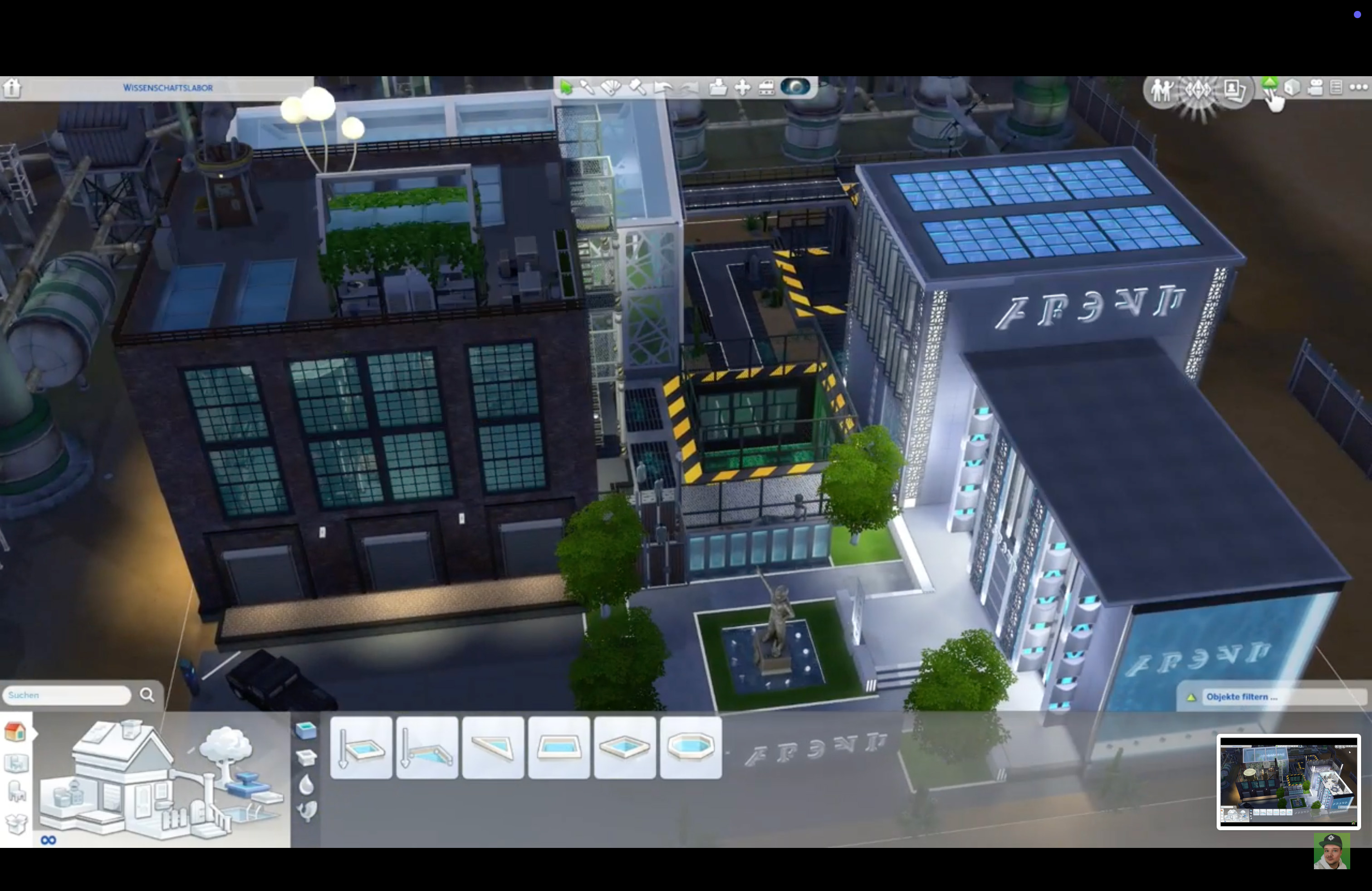 Abb. 6: Das fertiggestellte Labor des Spielers SimFans.de (eigener Screenshot aus SimFans.de: Wissenschaftslabor bauen #9 | Die Sims 4 An die Arbeit Karrieren Grundstück. https://www.youtube.com/watch?v=cCJPLGuLy2g&list=PLIa0vPINxr4D_DodwjsjrTfHioVZKX-2O&index=9 [00:19:50].