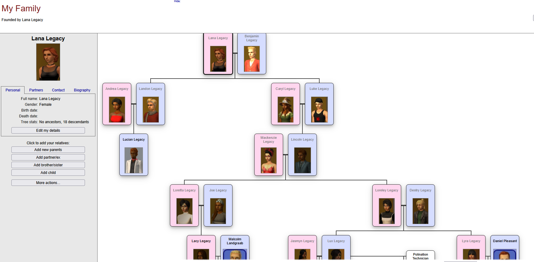 Eine weitere Art der ‚Buchführung‘ für die Legacy-Challenge sind Stammbaumseiten oder -apps. Viele Spielende nutzen diese um den Familienfortschritt zu überblicken und Zusatzinformationen einzubringen (wie Art und Ort des Sterbens oder beruflicher Werdegang). Rückblickend sind diese Informationen für Spielende nicht zugänglich, weshalb viel narratives Potenzial verloren gehen kann82. Meine Legacy-Familie beispielsweise habe ich über die Seite FamilyEcho festgehalten.