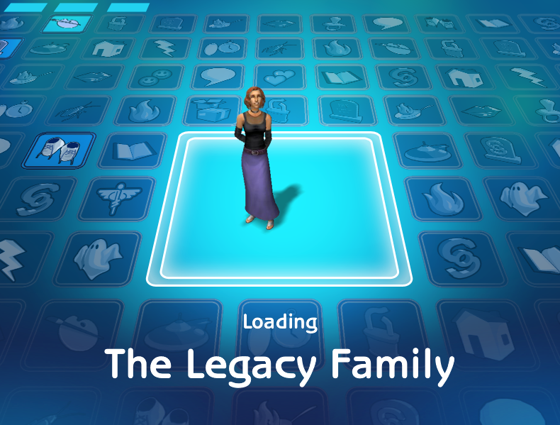 Der Screenshot zeigt einen Ladebildschirm in Die Sims 2. Darauf ist der Name des Spielstands ,,The Legacy Family" und eine Spielfigur abgebildet.