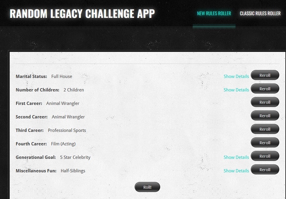 Der Screenshot zeigt die Random Legacy Challenge App. Darauf sind Kategorien aufgelistet, die man rerollen kann. Zum Beispiel: Number of Children, Generation Goal, First Career.