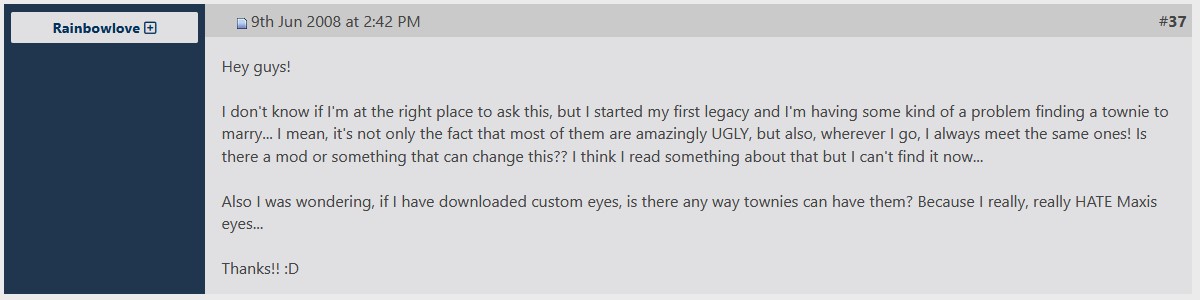 Der Screehshot zeigt einen Forumbeitrag von Rainbowlove. Darin steht: Hey guys! I don't know if I'm at the right place to ask this, but I started my first legacy and I'm having some kind of a problem finding a townie to marry... I mean, it's not only the fact that most of them are amazingly UGLY, but also, wherever I go, I always meet the same ones! Is there a mod or something that can change this?? I think I read something about that but I can't find it now... Also I was wondering, if I have downloaded custom eyes, is there any way townies can have them? Because I really, really HATE Maxis eyes... Thanks!! :D